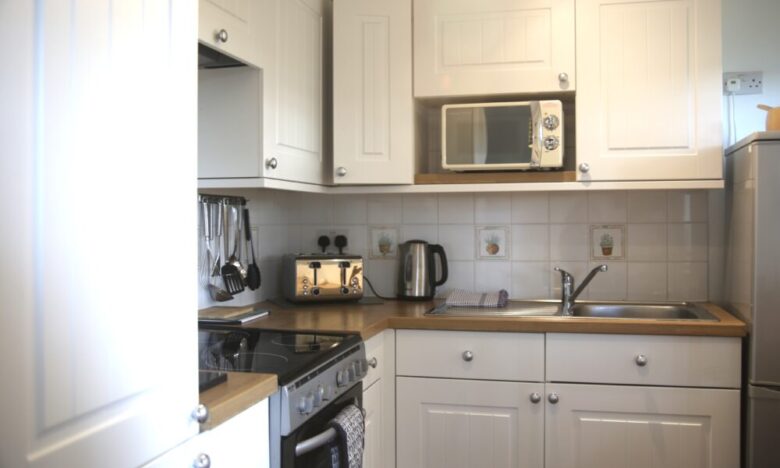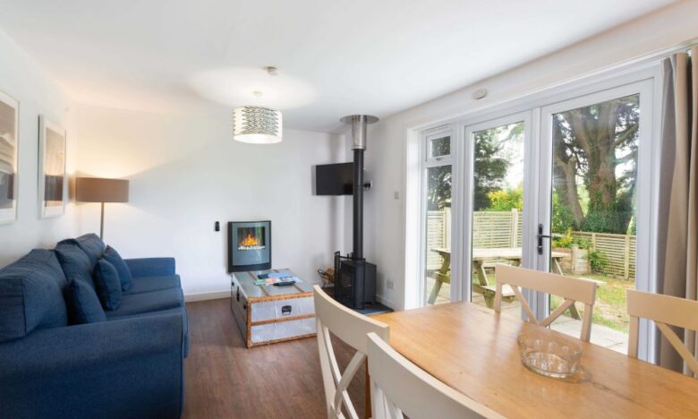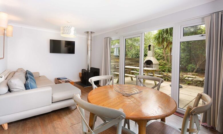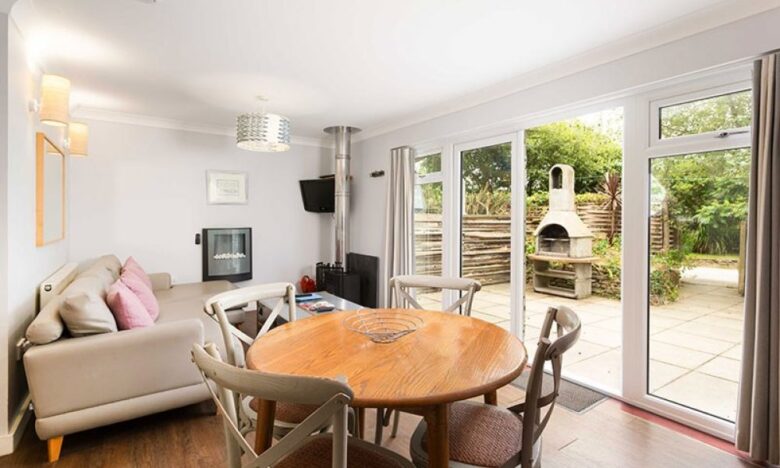 The cottage has an open plan kitchen, living and dining room with French doors that open out to the patio area.