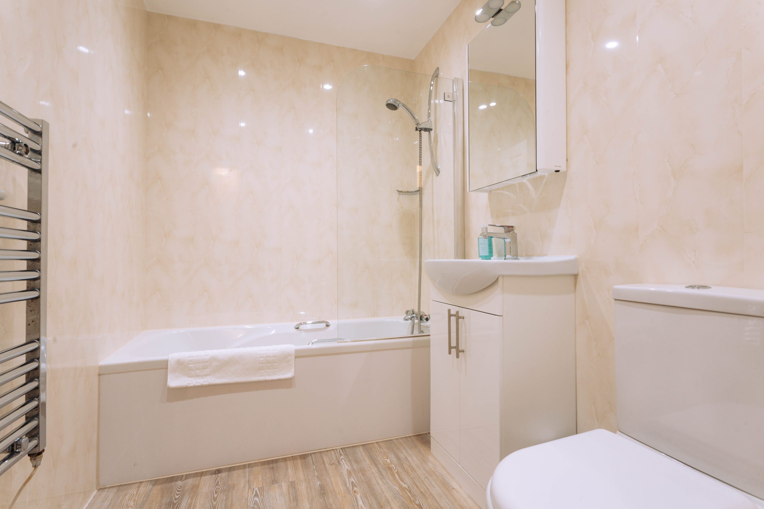 - Family bathroom with shower over the bath